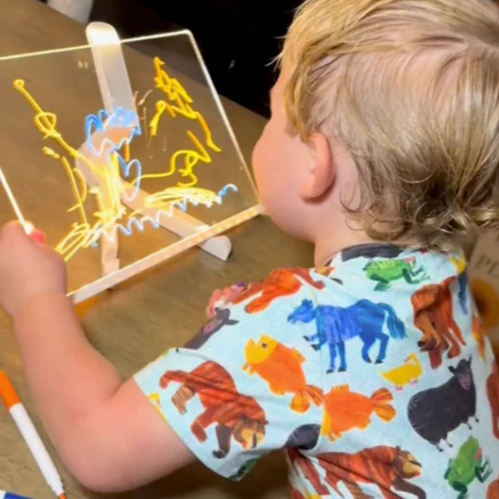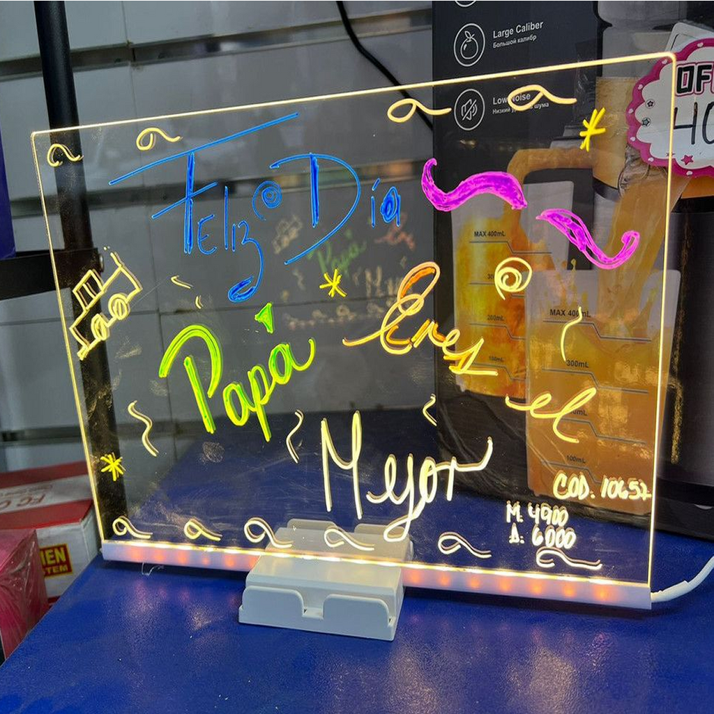 Más que un juguete, es una pizarra acrílica iluminada con LED que transforma horas de pantalla en momentos de imaginación, aprendizaje y diversión.
